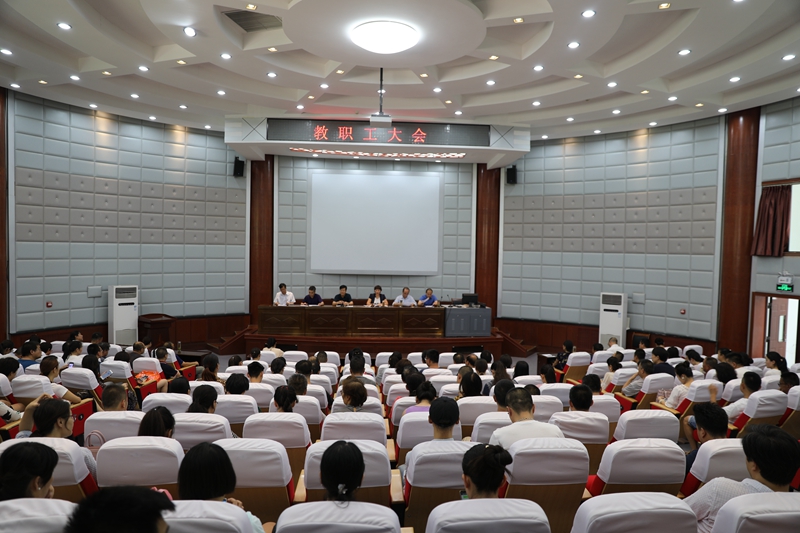 8月19日,学校在学术报告厅召开了新学期教职工大会。校领导以及全校教职工参加了会议。会议由党委书记潘慧琴主持,校长毛如君作了讲话。 会上,校长毛如君同志代表学校对暑假期间顶着烈日辛勤工作的同志表示了感谢,对暑期各项工作做了全面总结,从5个方面对学校2018—2019学年第一学期工作进行了全面安排部署,要求新学期主要做好以下工作: 一是要加强党的政治建设,推进全面从严治党;二是要加强教学管理,全面提高教育教学质量和教科研工作水平;三是要立德树人,构建全方位育人格局;四是要加强招生就业工作,提升就业服务质量;五是要齐抓共管,提高行政后勤工作质量。最后,毛校长强调,新的学期,我们要把学校的建设发展和教育教学质量、管理水平的提高作为各项工作的重中之重,正视困难、抢抓机遇,坚定信心、奋进拼搏,在激烈竞争中求生存、促发展,力争把学校建设好、发展好。