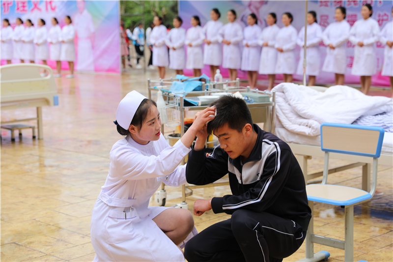由2018年省级护理技能大赛获奖选手带来的护理技能展示将本次活动推向了高潮。“头部包扎”、“心肺复苏”、“静脉输液”,紧张的氛围、娴熟的操作,将全体师生带到了护理岗位一线。整场展示仿佛在述说着一个动人的故事——关爱病人,如同关爱自己的亲人;救死扶伤,我们永远冲在第一线。