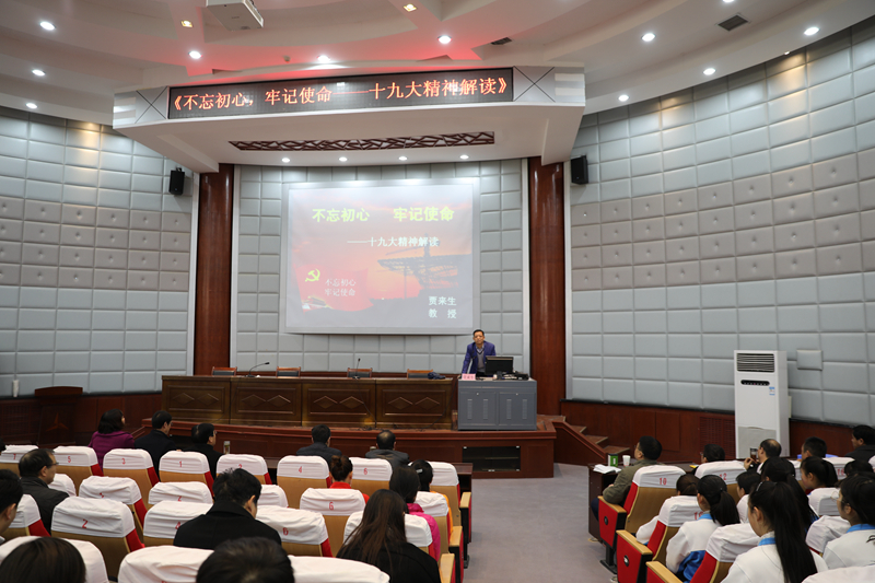 12月1日下午,中共天水市委讲师团成员、天水师范学院贾来生教授在我校学术报告厅做了以《不忘初心 牢记使命——十九大精神解读》为主题的宣讲报告,全体教职工以及学生代表200余人聆听了报告。