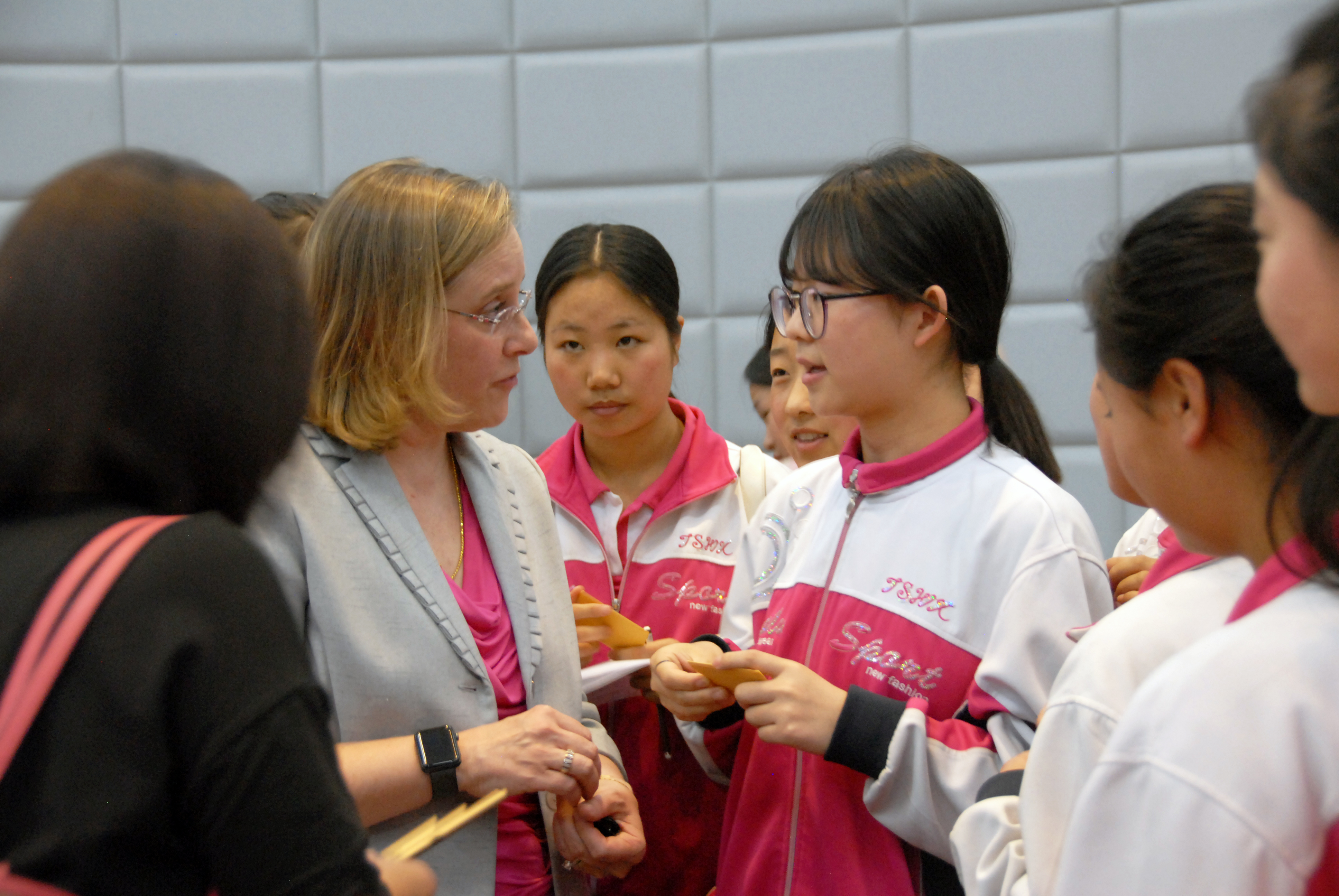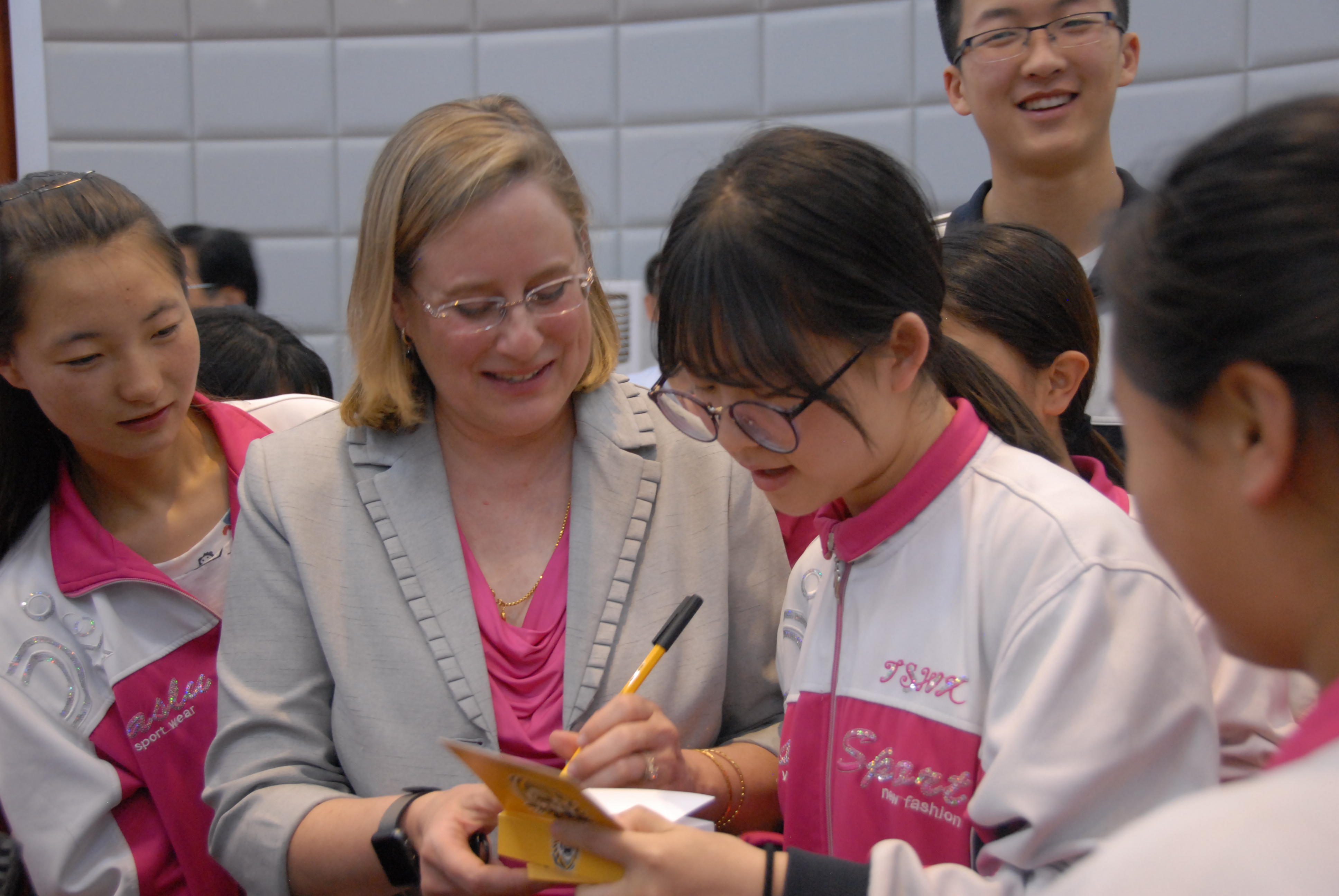 瓦莱丽·于教授的整场讲授在学校英语教师李鸿芳的翻译下,表达清楚、深入浅出,取得了比较好的效果。讲授结束后,瓦莱丽·于教授在给高职班学生们赠送的小礼物上签名、合影留念,并参观了校园。