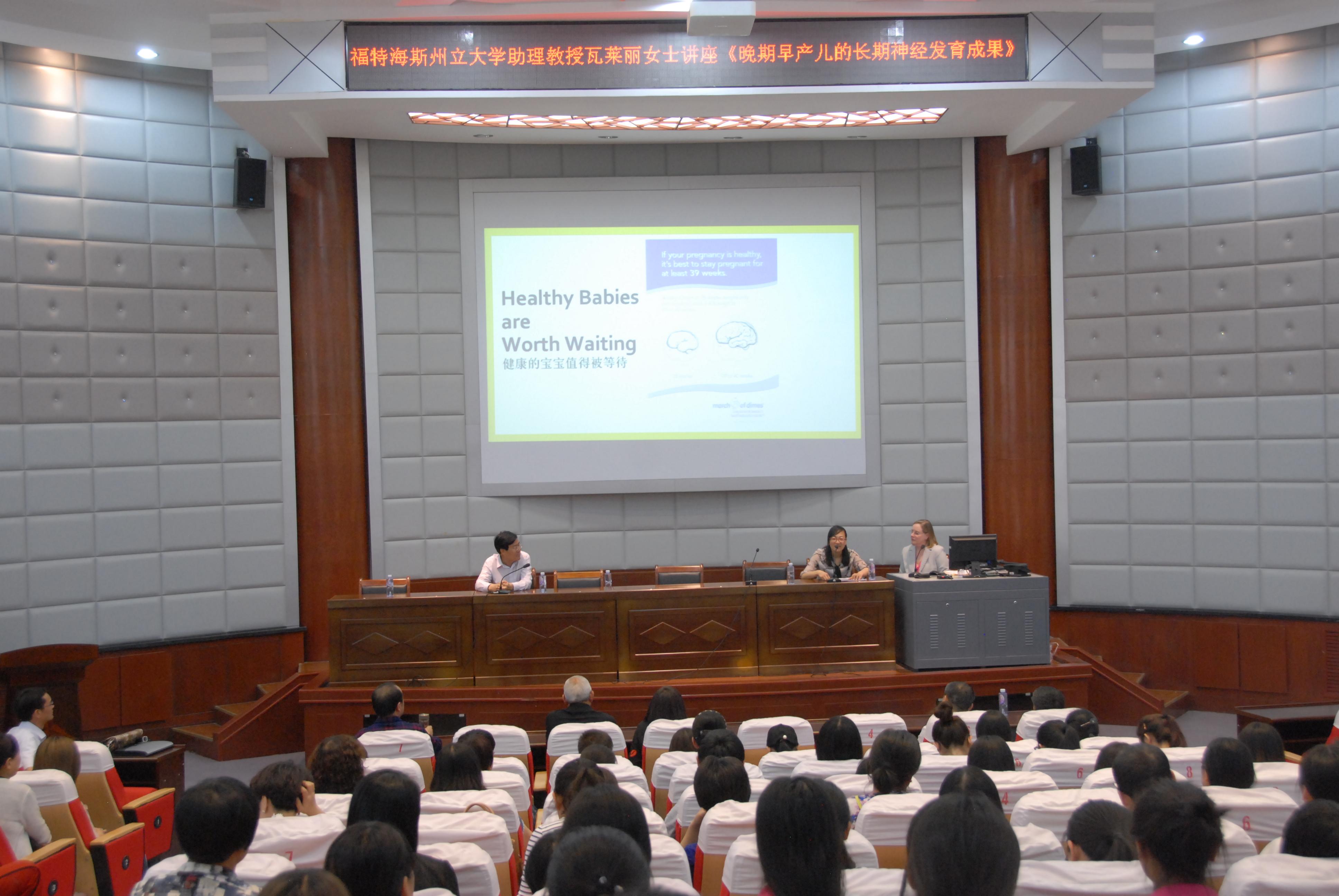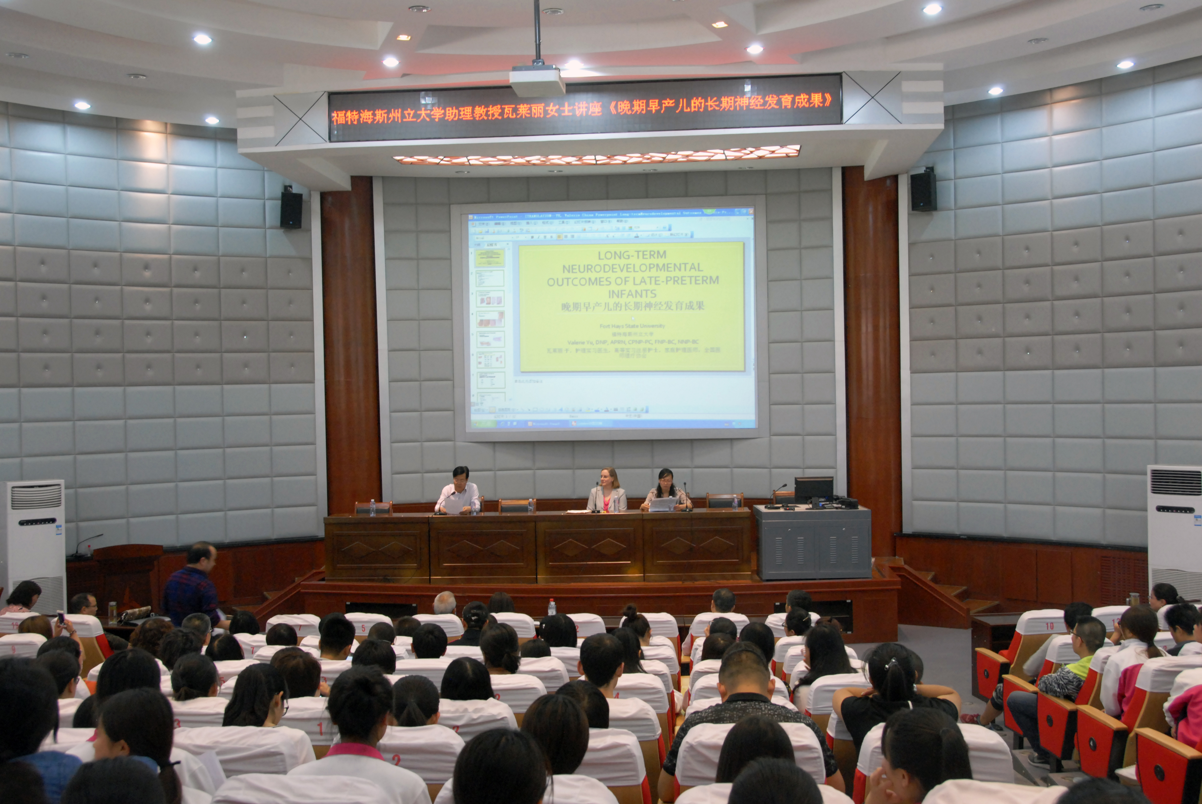 5月26日下午3时,学校在多功能厅举办了以“晚期早产儿的长期神经发育成果”为主题的讲座,邀请到的主讲人是美国福特海斯州立大学助理教授、护理实习医师、高等实习注册护士、家庭护理医师、全国医师理疗协会会员瓦莱丽·于女士。校领导、全体专兼职教师和部分高职班学生到场聆听。