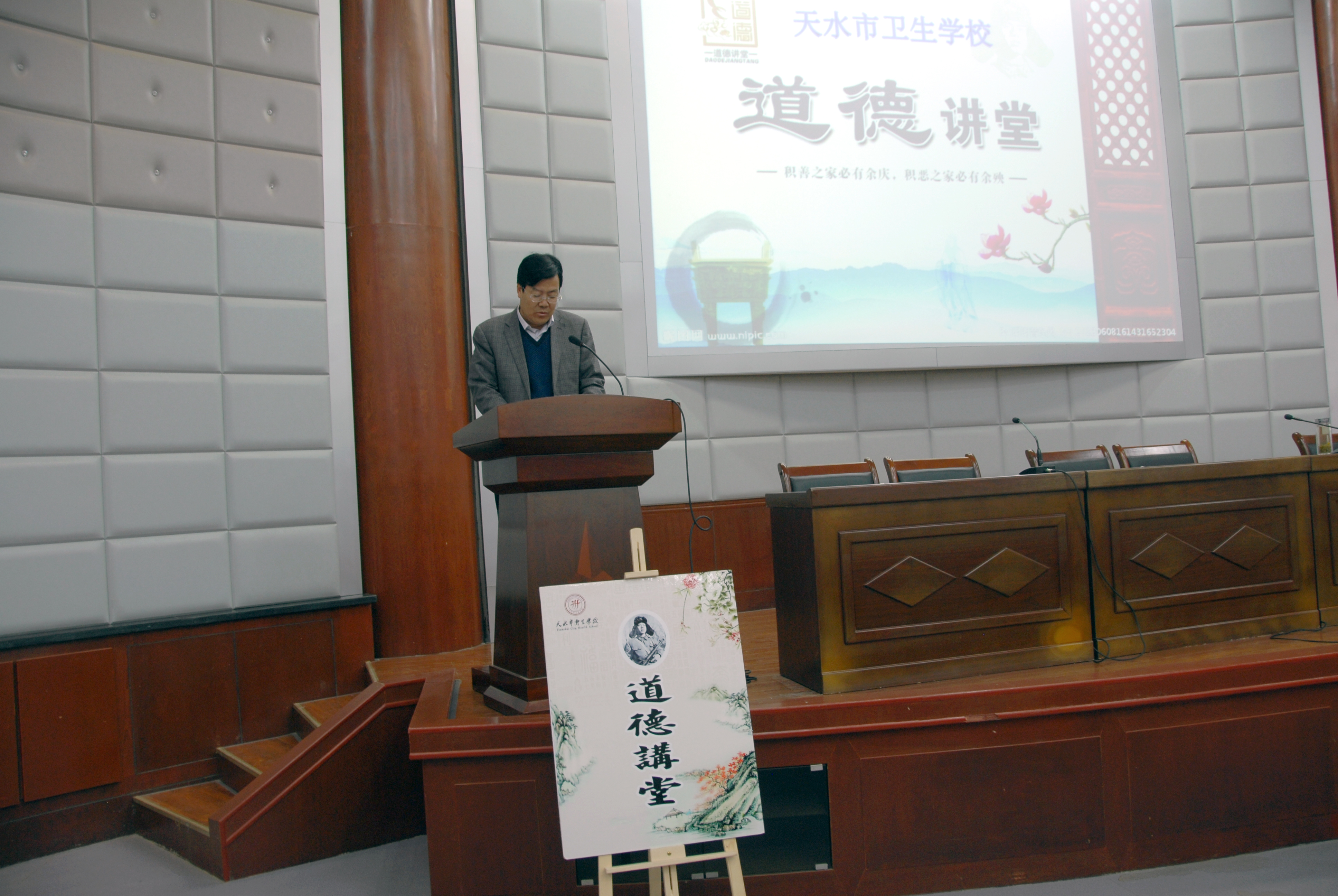4月11日下午,由校团委主办的天水市卫生学校“道德讲堂”启动仪式暨第一期专题讲座在多功能厅举行。校领导和优秀学生代表参加了此次活动。