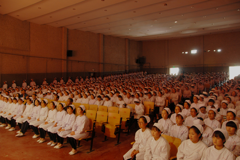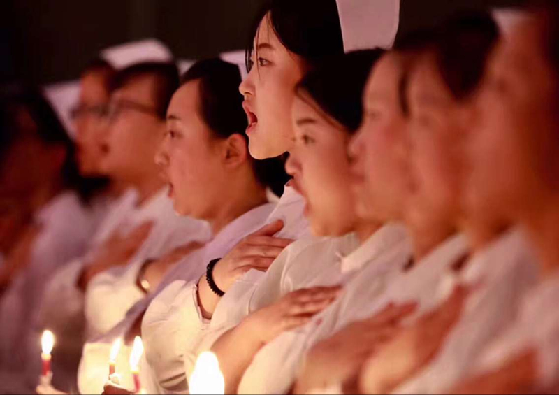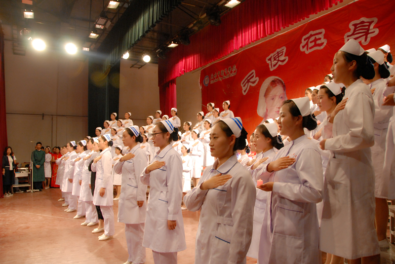 “余谨以至诚,于上帝及会众面前宣誓:终身纯洁,忠贞职守, 尽力提高护理之标准;勿为有损之事,勿取服或故用有害之药;慎守病人家务及秘密,竭诚协助医生之诊治,务谋病者之福利。” 南丁格尔像前的宣誓,更是让全场师生感受到了护理事业的庄重与严谨。宣誓仪式场面壮观感人,使每位参与者深受教育。