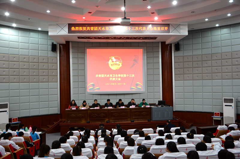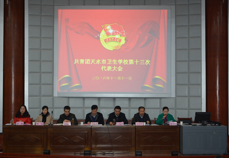 2016年11月11日上午, 共青团天水市卫生学校第十三次代表大会在学术报告厅隆重举行。共青团天水市委书记王龙强、组宣部部长师伟、权益部部长冯涛和我校领导出席本次大会。大会还邀请到甘肃工业职业技术学院、甘肃机电职业技术学院、天水市职业学校、逸夫实验中学等兄弟院校团委负责人和学校各职能部门负责人。参加本次大会的正式代表共179人,其中教工代表5人。