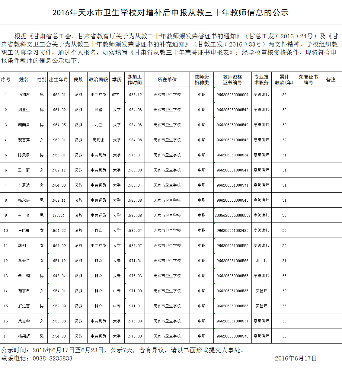 2016年天水市卫生学校对增补后申报从教三十年教师信息的公示