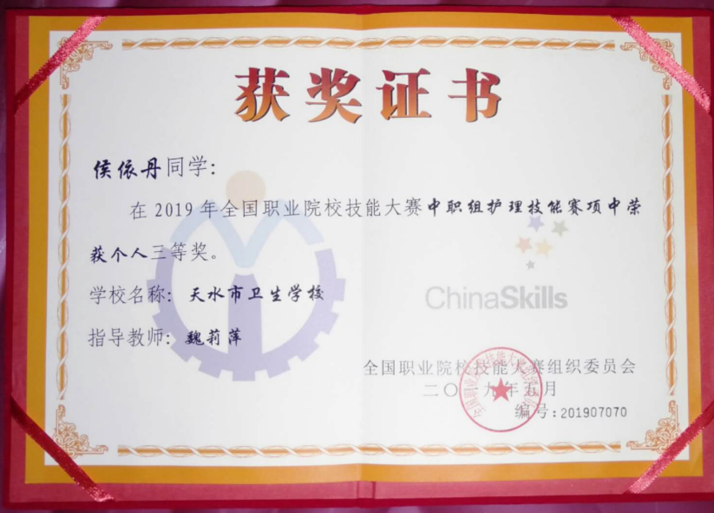 经过3天的激烈比拼,我校2017级护理7班学生侯依丹荣获国赛三等奖,为甘肃省和我校赢得了荣誉。