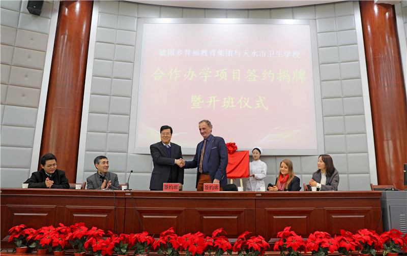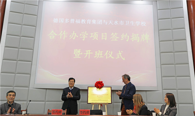 天水市卫生学校校长毛如君与德国多普福教育集团分校校长马丁·格莱思纳签订了“中德康养护理实验班合作办学协议”,并共同揭牌。