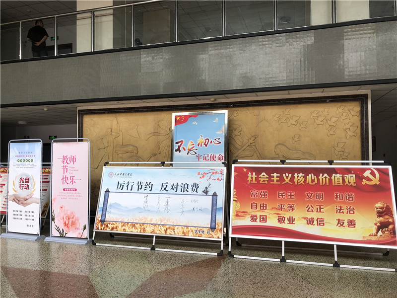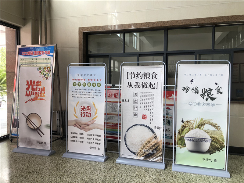 教学楼大厅、餐厅门口放置习近平总书记关于节约粮食的重要指示图片展板,利用学校网站、电子屏幕等广泛宣传活动主题。