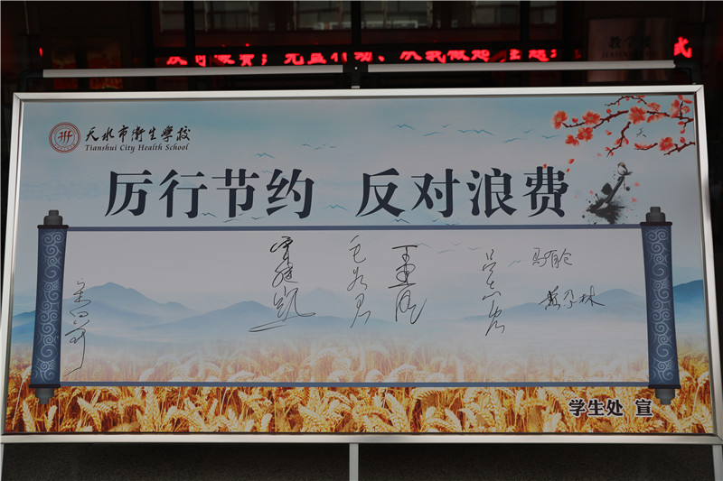 9月9日下午,学校隆重举行“厉行节约、反对浪费”主题教育活动签名启动仪式。仪式由学生处主任莫凡主持,学校领导班子全体成员、全体师生参加了签名启动仪式。共青团天水市委副书记赵强出席签名启动仪式并对全体师生发出勤俭节约的倡议;校团委书记孙文婷向全体学生发出了“厉行节约,反对浪费”的倡议;学生处对长期开展“厉行节约,反对浪费”活动作出了全面安排。