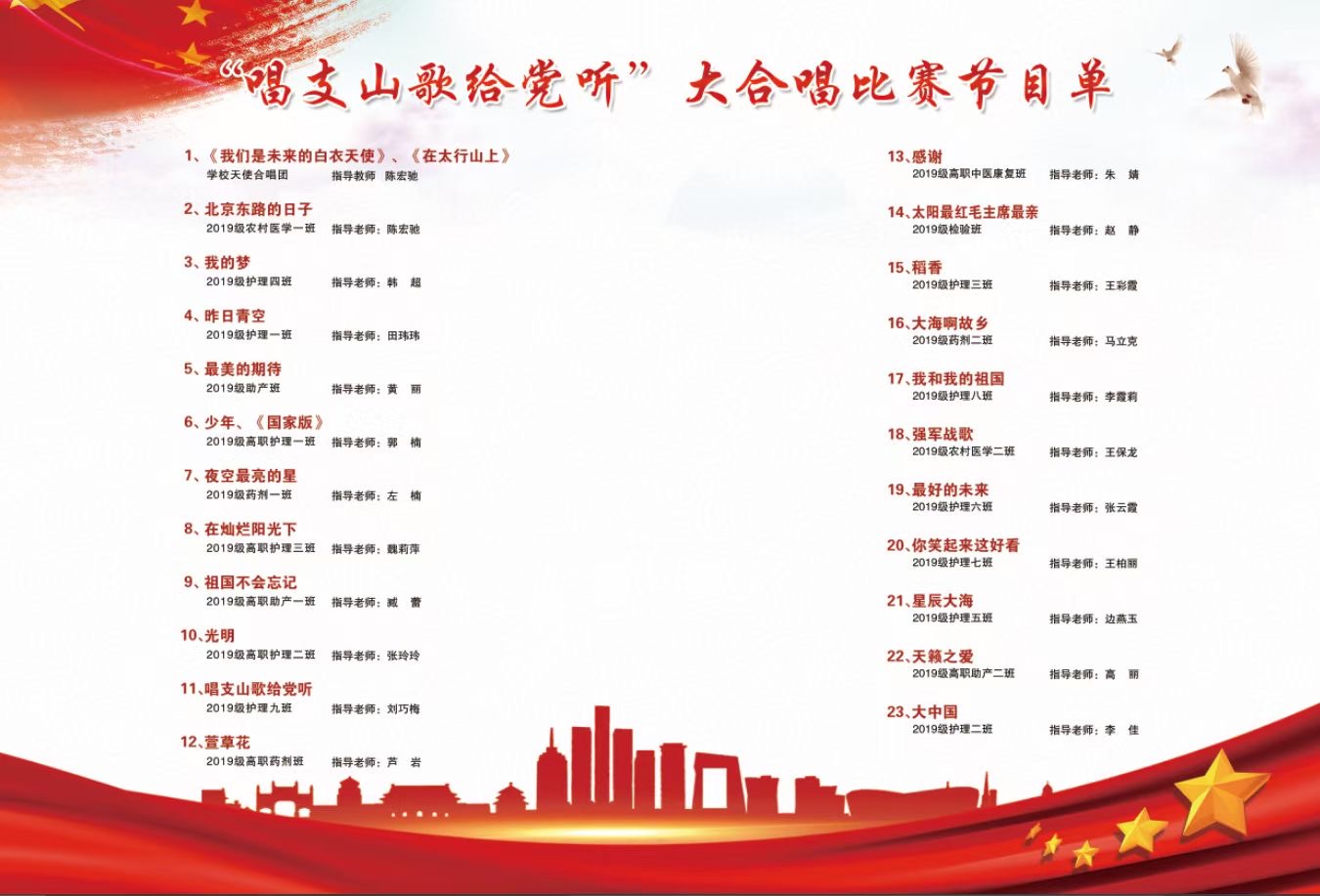 本次大合唱的歌曲选题是以歌颂党、歌颂祖国、歌颂人民、歌颂青春、弘扬中国传统文化、倡导社会和谐及健康生活为主,比赛在学校领导的关心支持下,在音乐教师的精心指导下,在各班班主任的积极配合下经过紧张的角逐,活动圆满成功。
