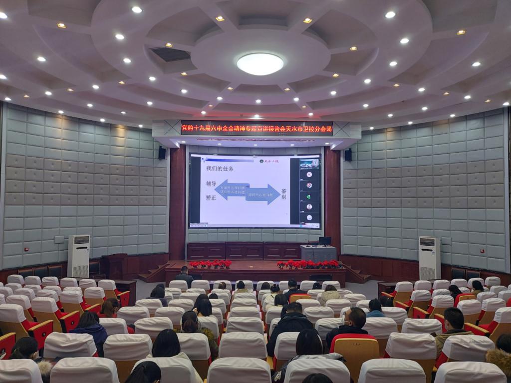 12月14日下午,学校特邀天水市第三人民医院医学心身科张子明主任通过腾讯会议为我校教师开展《学生常见心理问题的识别和应对》的线上心理健康讲座。根据有关疫情防控工作要求,近70名班主任在学校多功能报告厅观看讲座,其余教师利用手机端在线观看。