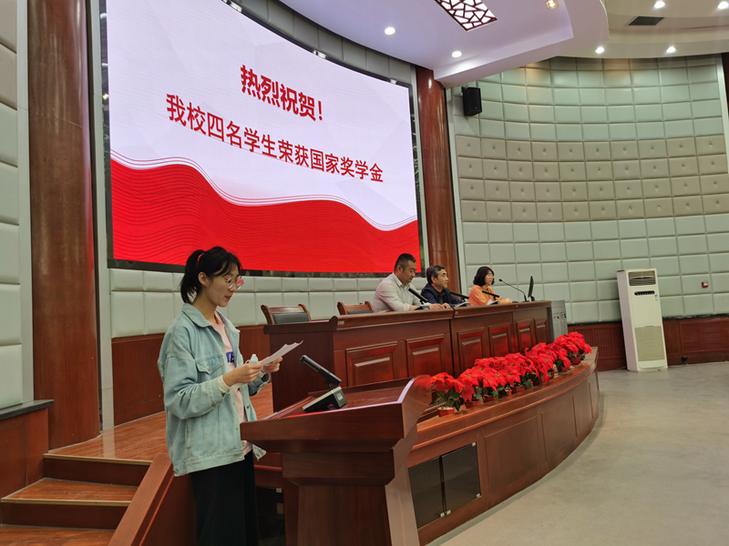 学生处主任莫凡主持了颁发仪式,副主任刘利敏简要介绍了4名获奖学生的先进事迹,副校长宋继凯为2021年国家奖学金获奖学生颁发了荣誉证书。获奖学生代表上官雪茹做获奖感言。