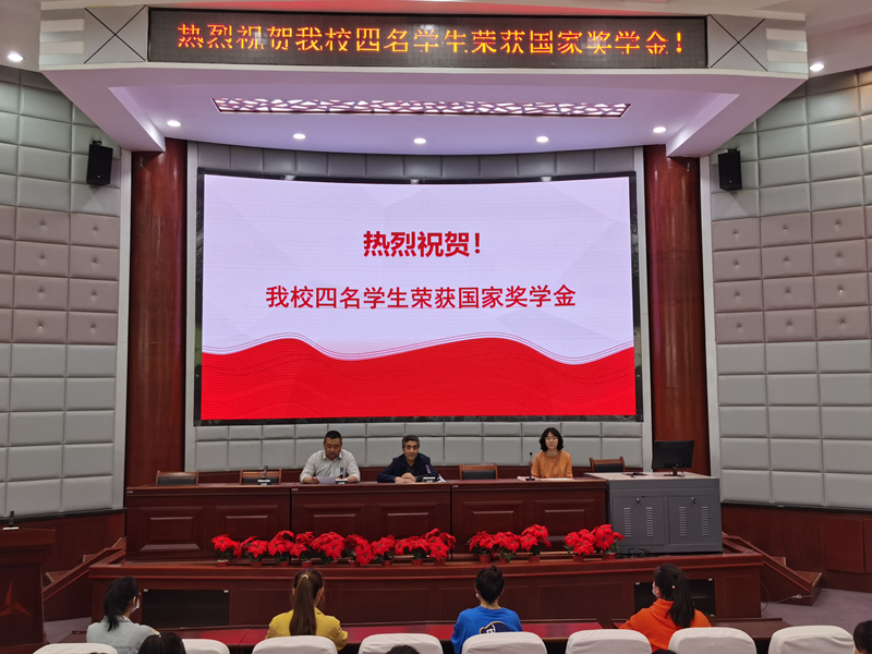 5月20日上午11时,我校在多功能报告厅举行2021年国家奖学金荣誉证书颁发仪式。副校长宋继凯、学生处主任莫凡、副主任刘利敏、学生处工作人员、4名国家奖学金获奖学生及100名学生代表参加了此次活动。