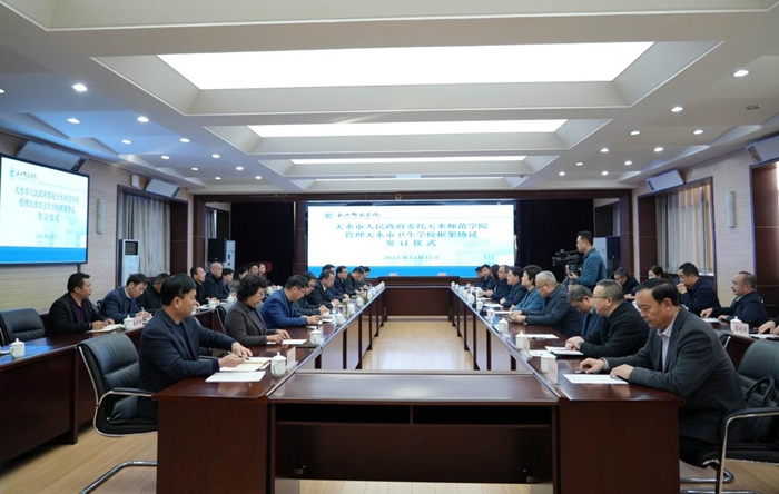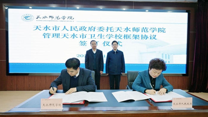 王国先指出,由天水师范学院托管天水市卫生学校,是市委、市政府优化区域高等教育布局、整合提升优质教育资源、统筹推进高等教育和职业教育高质量发展的重大举措。希望两校以此次签约为契机,进一步凝聚思想共识,拓展合作领域,不断创新教学、科研、管理联动机制,加快建设集医疗卫生人才培养、成果转化、康养服务为一体的生命健康教育群,高质量推进两校深度融合发展,更好满足人民群众对优质教育、医疗资源的需求。市委、市政府将始终把教育放在优先发展的重要位置,不断加大对驻市高校的支持力度,以更加密切的沟通、更加完善的保障、更加高效的服务,全力推动校地合作再上新台阶、办学质量取得新成效。