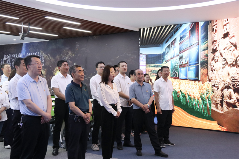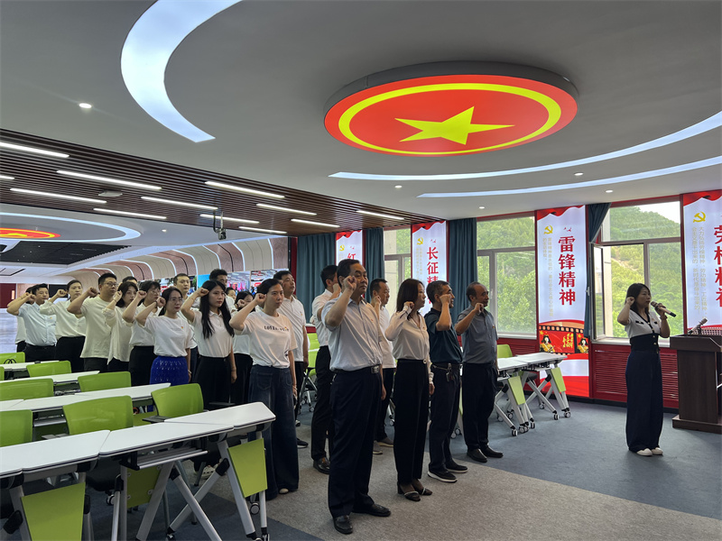 在示范性虚拟仿真实训基地,现场体验虚拟仿真《中国共产党历史展览馆》课程资源。全体党员干部重温入党誓词,一声声坚定的誓言、一个个有力的承诺,无一不在向革命先烈表达崇敬之情,向党表达忠诚和决心。