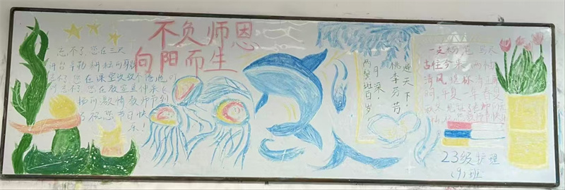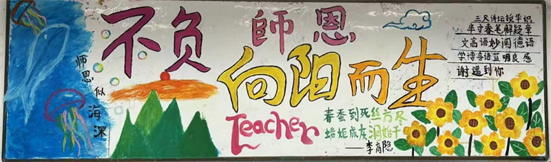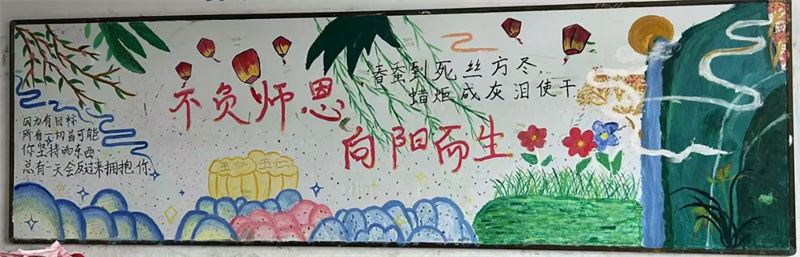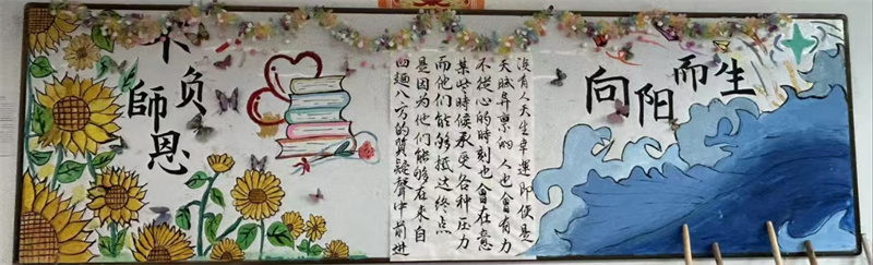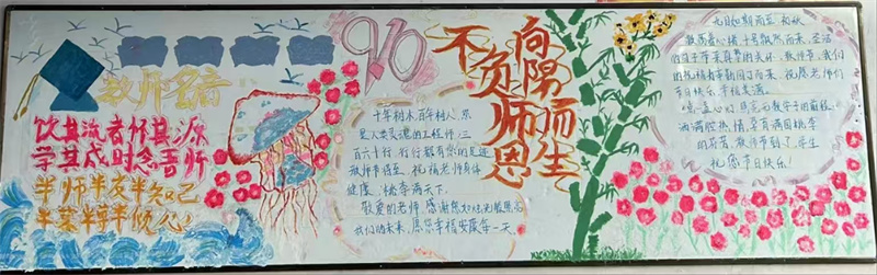 黑板报是班级文化建设的阵地,鲜艳的色彩、整洁的布局、积极的内容和鲜明的主题为教室增添了一道亮丽的风景线。不仅让同学们懂得感恩,铭记师恩,营造尊师重教的良好氛围,也进一步激发广大教师履行教书育人的使命感和责任心。