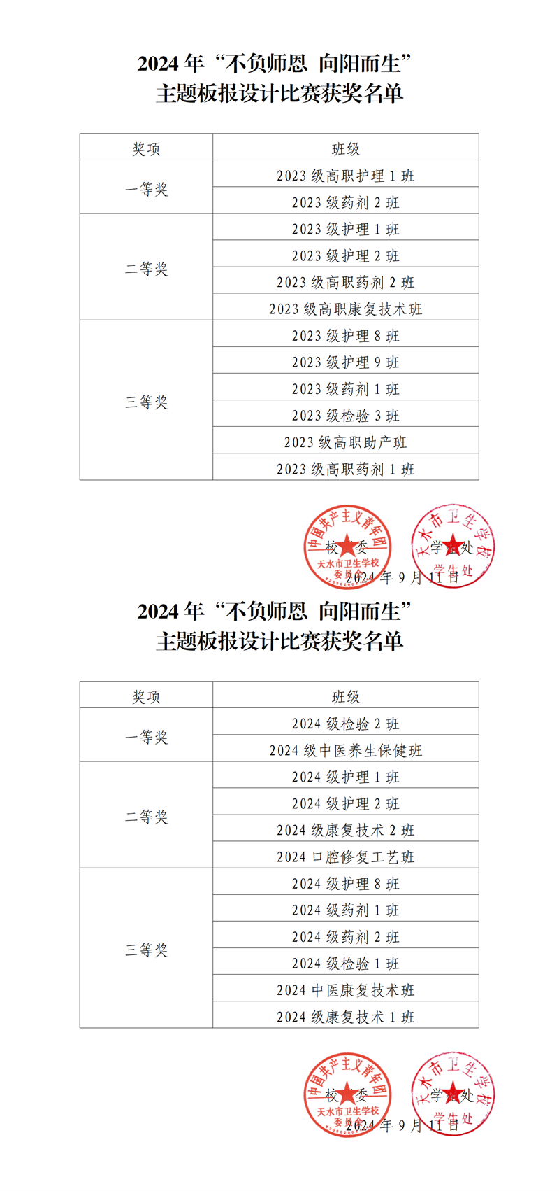 经评审,2023级高职护理1班、2024级检验2班等4个班级获一等奖;2023级护理1班、2024级护理1班等8个班级获二等奖;2023级护理8班、2024级护理8班等12个班级获三等奖。