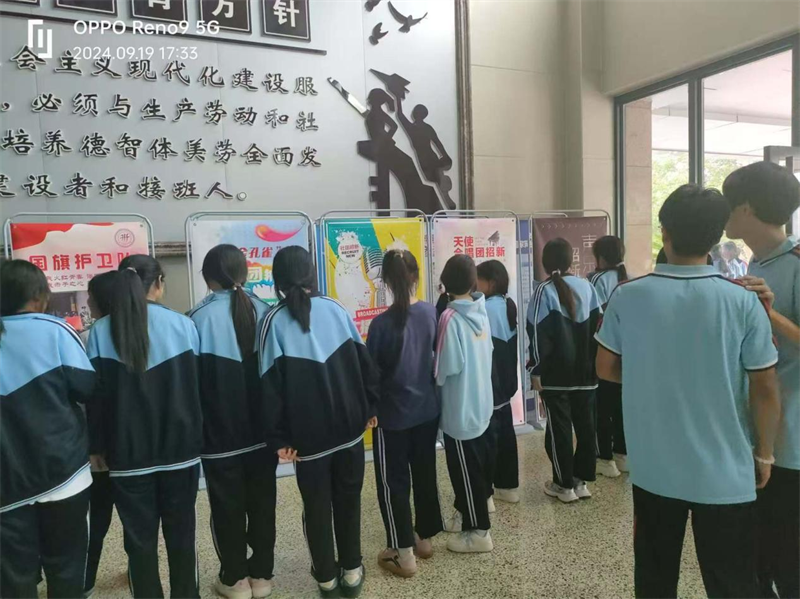 社团海报深深吸引同学们驻足观赏。天使合唱团的资深成员正和新同学热络交谈,讲述着自己在活动中得到的收获和历练;国旗护卫队处,社团成员正在给同学们展示在社团课中的一招一式;广播站社团前,同学们已排起长队……
