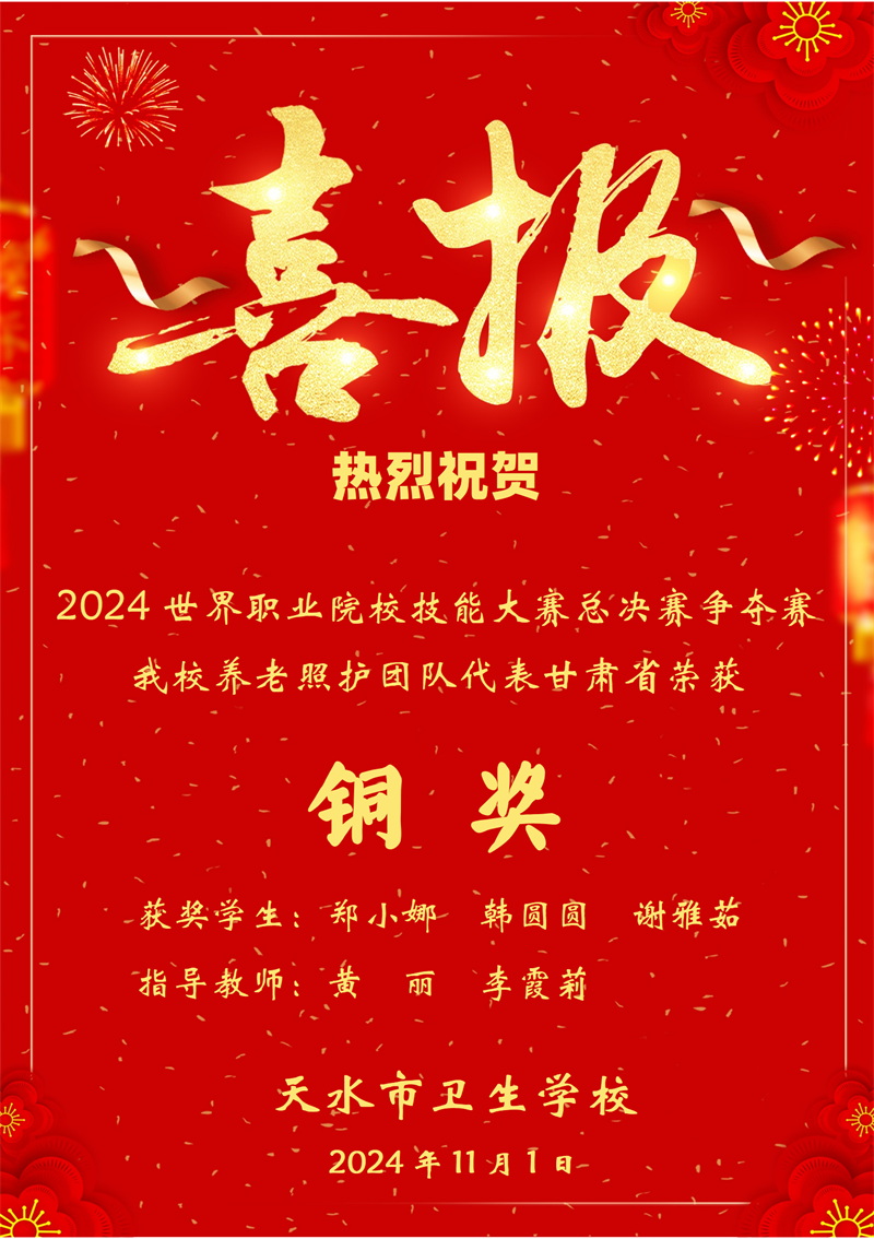 10月23-31日,由教育部、国家发展改革委、科学技术部等部门联合主办的2024年世界职业院校技能大赛总决赛争夺赛在全国各地赛区火热进行。本次大赛作为全国职业院校技能大赛全面升级为世界职业院校技能大赛的第一届比赛,吸引了众多国内外职业院校优秀选手积极参与。我校作为甘肃省代表队之一,积极备战并参与了“康复技术”“养老照护”“母婴照护”三个赛项的激烈角逐。在比赛中,选手们充分展现了扎实的专业技能、良好的职业素养以及出色的团队合作精神,经过多轮比拼,最终脱颖而出,斩获一银一铜的优异成绩。