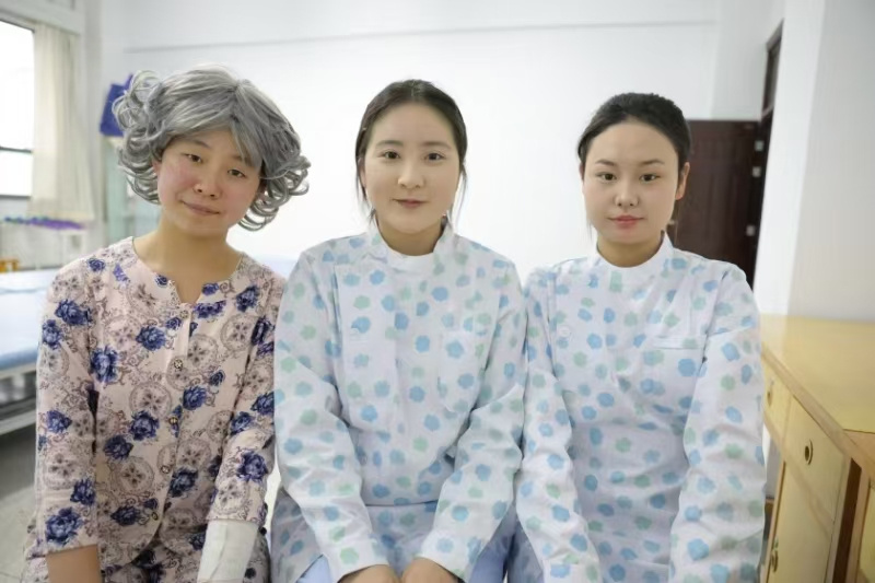养老照护赛项比赛选手谢雅茹、韩圆圆、郑小娜