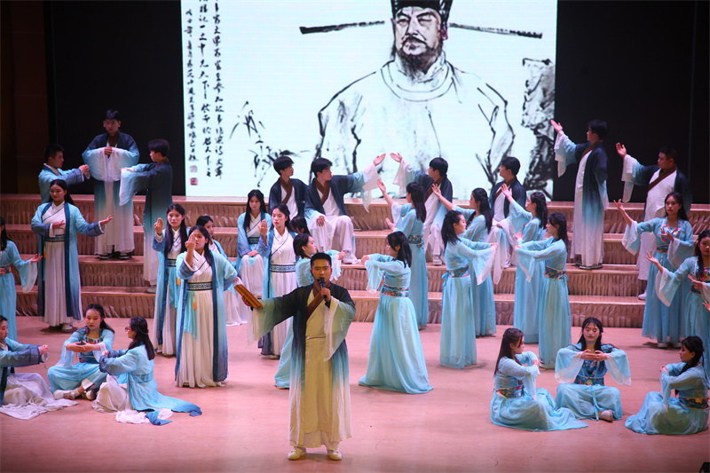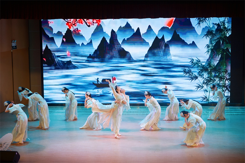 五千年的历史是一幅波澜壮阔的画卷,更是我中华民族的血脉脊梁。声乐社团的合唱曲目《岳阳楼记》、2024级护理5班的古典舞《诗雨染江南》、婴幼儿托育2331班的孔雀舞《彩云之南》等展现了传统文化的魅力和勃勃生机,绽放了新的时代风采。