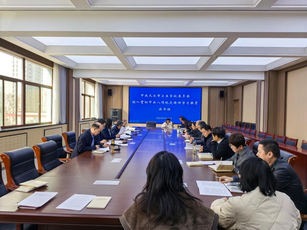 按照中央、省市委开展深入贯彻中央八项规定精神学习教育安排部署,市卫校党委于3月31日上午举行读书班开班式暨第一次集中学习,认真学习了《十八届中央政治局关于改进工作作风、密切联系群众的八项规定》和《中共中央政治局贯彻落实中央八项规定实施细则》。党委书记张秀丽主持会议并讲话,校党委班子成员、各党支部书记、支委和各科室负责人参加。