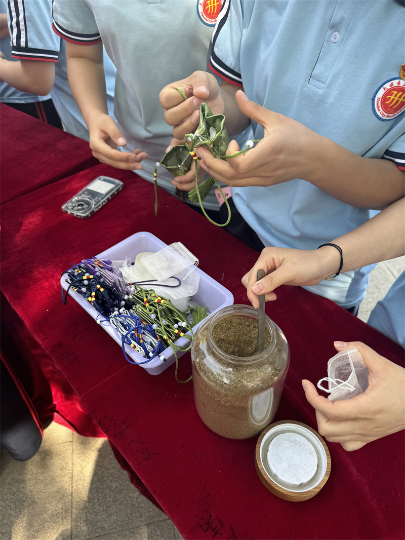 活动现场同步设置中医药文化展区,陈列端午药材标本,吸引师生驻足研读。“这枚香囊芯包含艾叶、薄荷、白芷等12味药材,既有驱蚊提神之效,又暗合中医‘扶正祛邪’的养生理念。”中医组教师现场解密香囊背后的科学配伍,将中药药包装入锦袋中,这些满载文化寓意的香囊,既可佩戴驱虫,亦可悬挂清心,成为今夏受师生追捧的“健康时尚单品”。