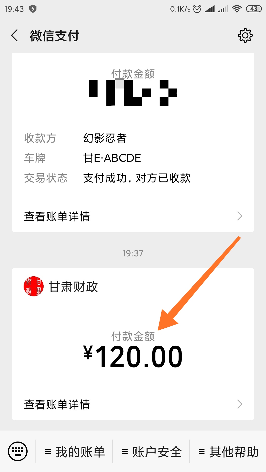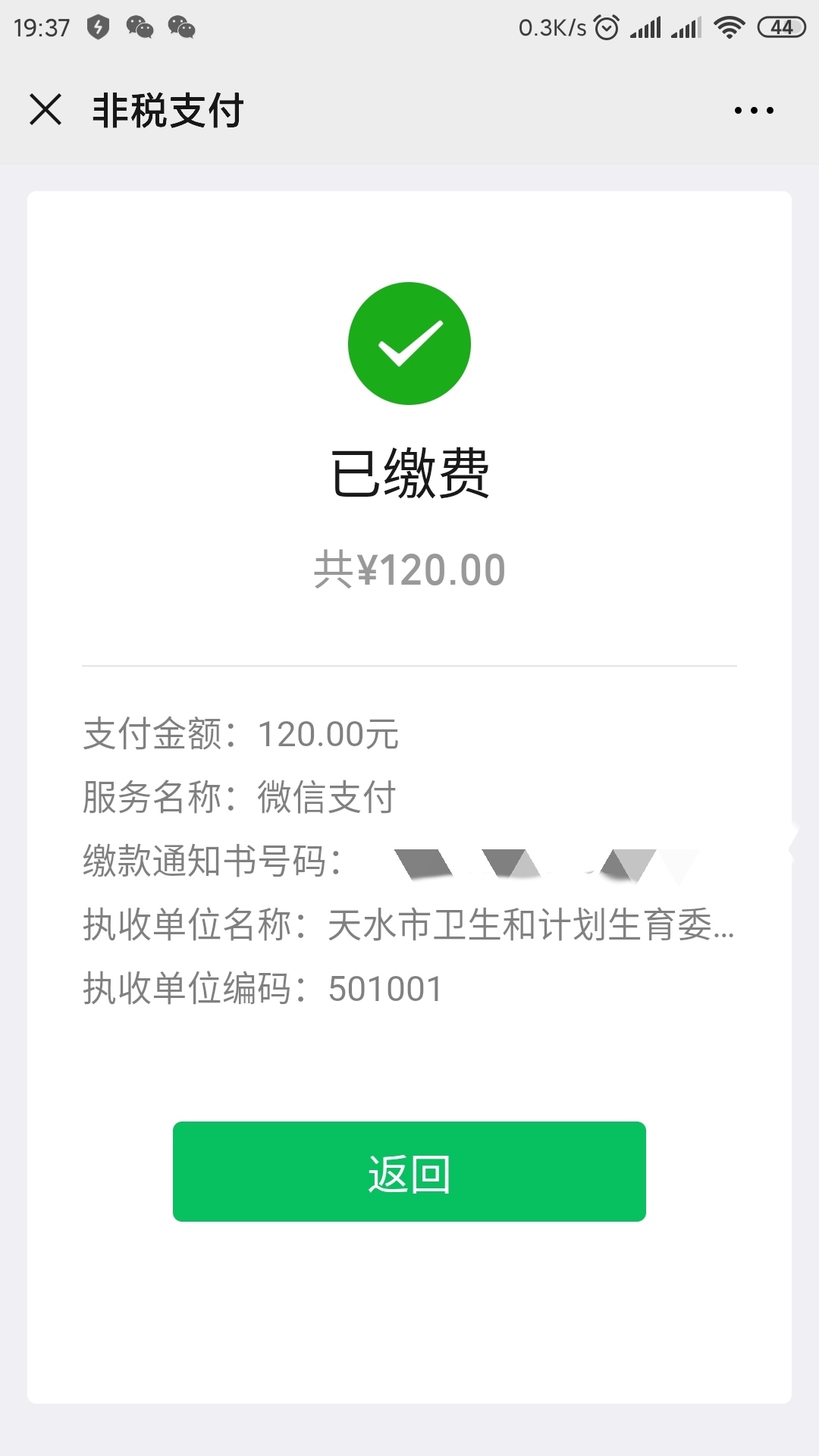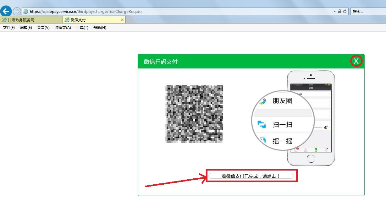 第六步:以“微信支付”为例,打开手机微信中的“扫一扫”,扫描屏幕中的二维码,进行支付,支付成功后,点击已完成或微信扫码支付页面的右上角“×”,此时,手机会再次收到“甘肃省财政厅”发送的“已缴款确认”短信。如下图: