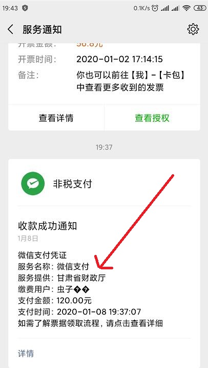同时,也可在手机微信界面的“微信支付”和“服务通知”里查看具体缴费详情。如下图:
