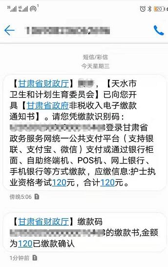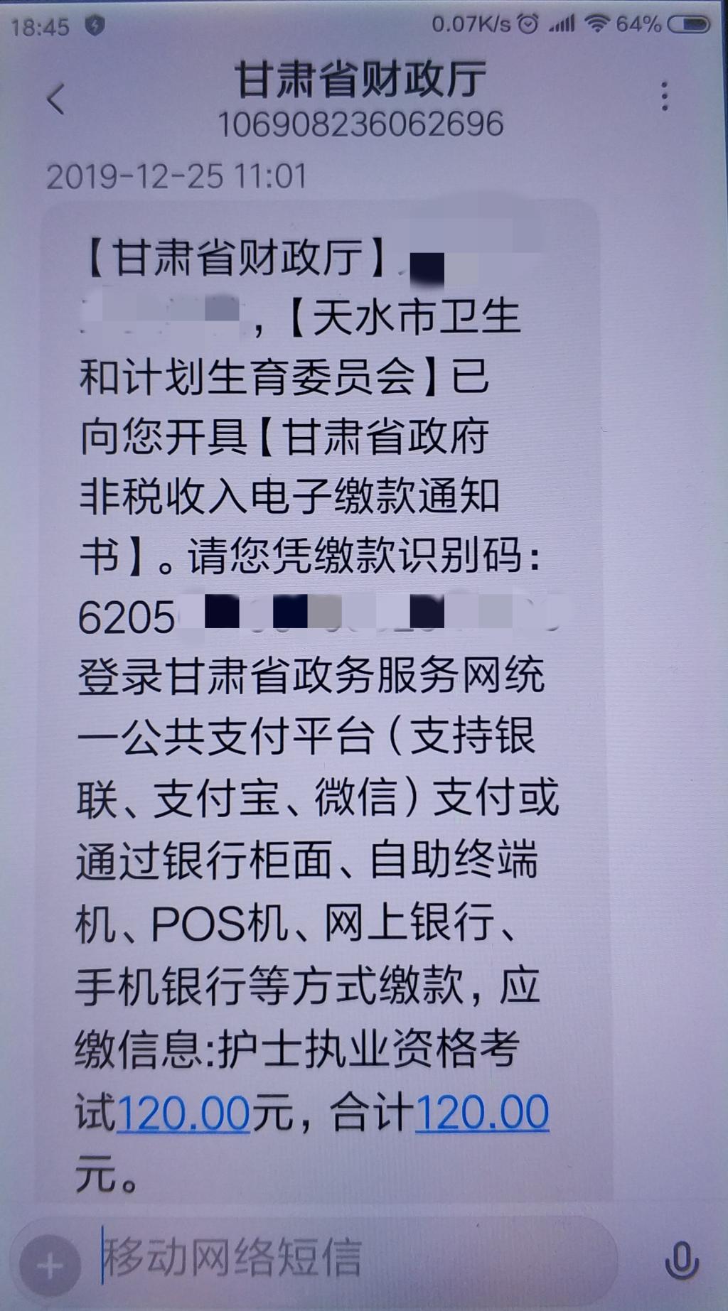 第一步:网报结束,现场确认成功后,网报和现场确认时预留登记的手机号,会在规定的时间内收到一条由“甘肃省财政厅”发送的“电子缴款通知书”短信。如下图: