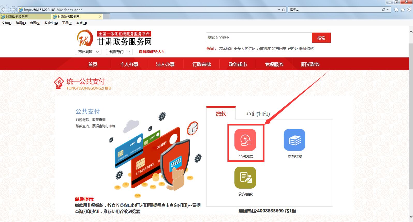 第三步:进入“统一公共支付平台”后,点击“缴款”选项中的“非税缴款”。如下图: