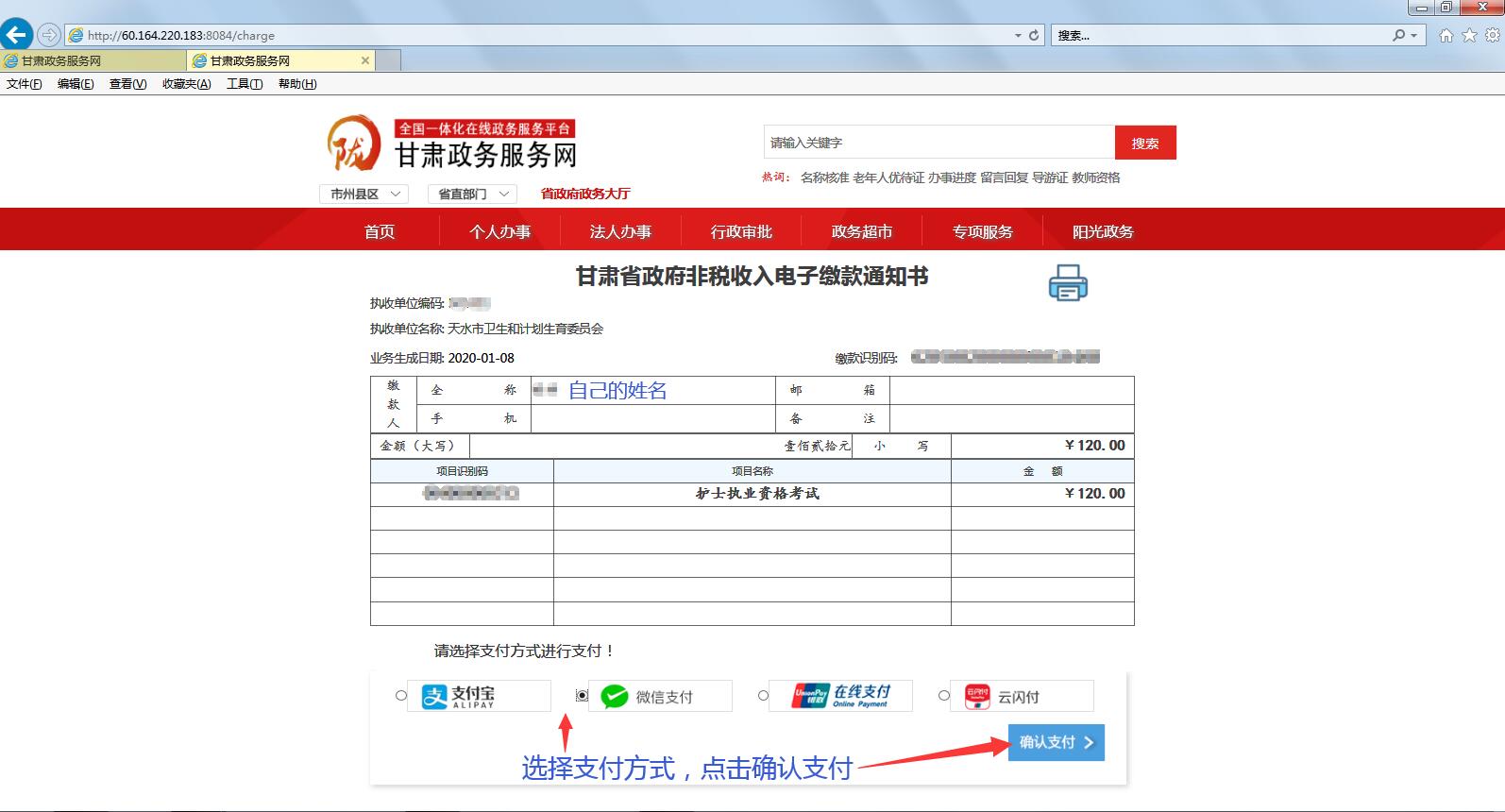 第五步:弹出“甘肃省政府非税收入电子缴款通知书”,核对姓名、项目名称、金额,然后选择支付方式,再点击“确认支付”。如下图: