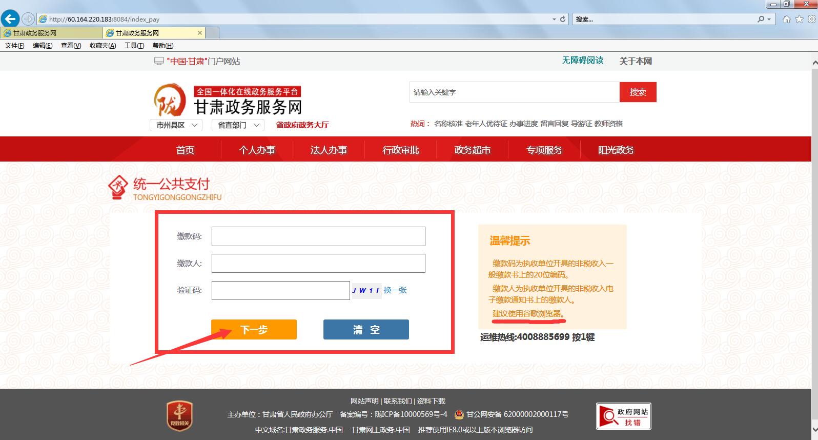 第四步:进入“非税缴款”页面,输入手机短信中的缴款码和相应的缴款人及验证码,点击“下一步”。如下图: