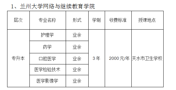 2020年,我校继续与兰州大学网络与继续教育学院、甘肃医学院继续教育学院合作办学,招生专业、层次见下表。