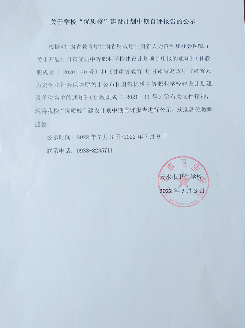 天水市卫生学校 “优质校”建设计划中期 自评报告