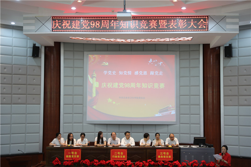为热烈庆祝建党98周年,深入学习贯彻习近平新时代中国特色社会主义思想和党的十九大精神,6月26日下午,学校召开了庆祝建党98周年知识竞赛暨表彰大会。