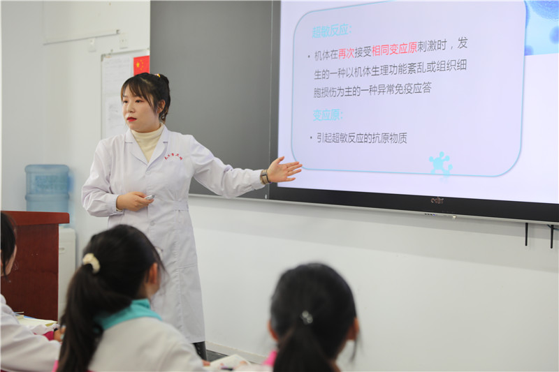 10月19日下午,我校在教学楼418教室组织了本学期第一次公开教学活动。基础教研室赵静老师进行了《免疫学检验技术》课程中“超敏反应及检测技术”章节的公开教学。校领导及专兼职教师110余人到场聆听。