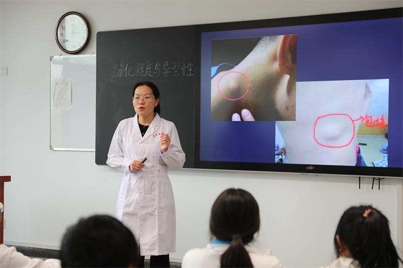 赵老师就《病理学基础》课程中“肿瘤的分化程度与异型性”的内容进行了一堂精彩纷呈的公开示范课。赵老师举止大方、教态自然,语言平实、讲解清晰,教学环节完整,课件制作精美,并恰当运用图片演示、动画、视频等多种信息化教学手段,将医教协同、大医精诚等思政元素融入其中。课堂气氛融洽,师生积极互动,取得了良好的教学效果,达到了公开示范教学的目的,给全体观摩教师留下了深刻的印象。大家一致认为本节示范课精心打磨、讲授精彩,切实起到了非常好的示范引领作用,纷纷表示在今后的教学中要深入研究教材、教法和学生,努力提高课堂教学水平,打造让学生喜欢且受益的“金课”。