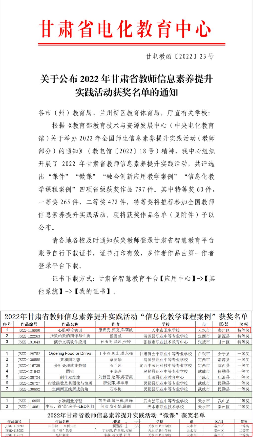 近年来,我校高度重视教师信息素养的提升和数字化教学资源的建设。此前,在甘肃省教师信息素养提升实践活动中,刘明霞老师提交的作品《共价键——互利共生》荣获省级一等奖;丁奋霞、许翠翠、左楠团队提交的作品《谈“啡”色变》和李燕、杨文思、汪芹团队提交的作品《毫针刺法》均荣获省级二等奖佳绩。