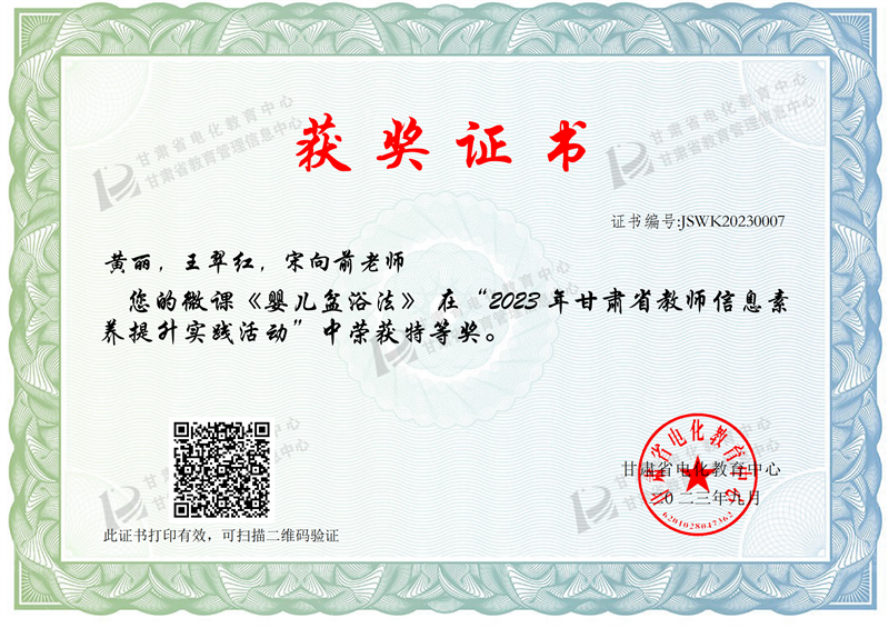 12月18-20日,由教育部教育技术与资源发展中心(中央电化教育管)主办的“2023年度教师信息素养提升实践活动”在北京举行。来自全国的教育管理者、名师代表、教师活动代表以及众多信息技术领域专家参加了交流、展示和分享活动。我校黄丽、王翠红、宋向前教师团队制作的《婴儿盆浴法》微课作品做为甘肃省唯一一部受邀作品参加了现场交流活动。该作品在2023年甘肃省教师信息素养提升实践活动中荣获微课赛项特等奖。