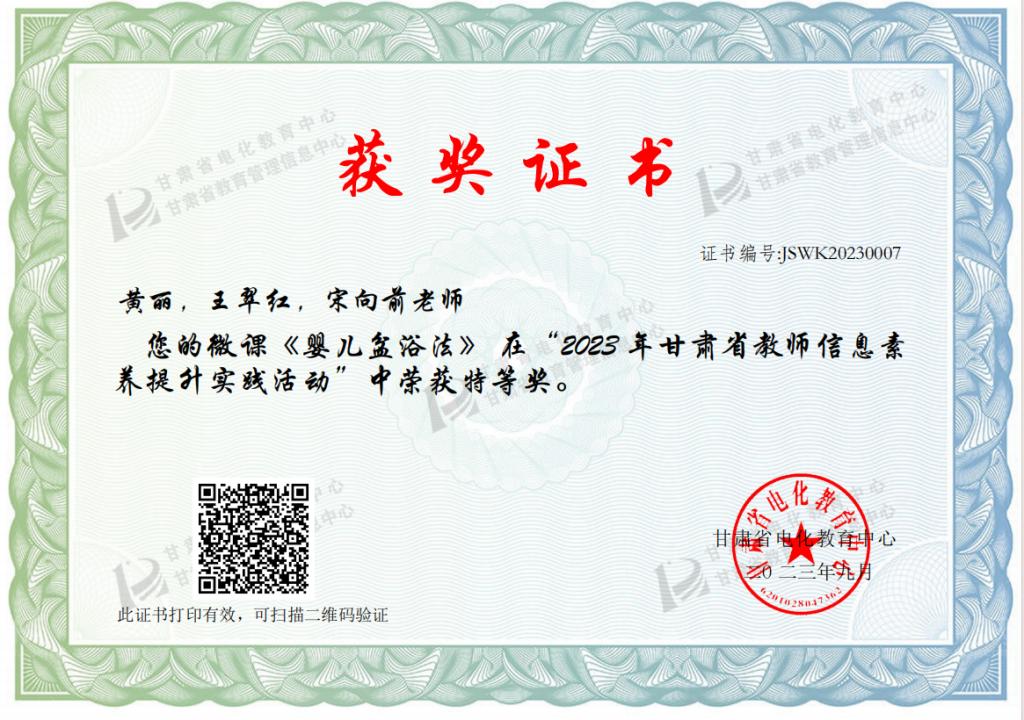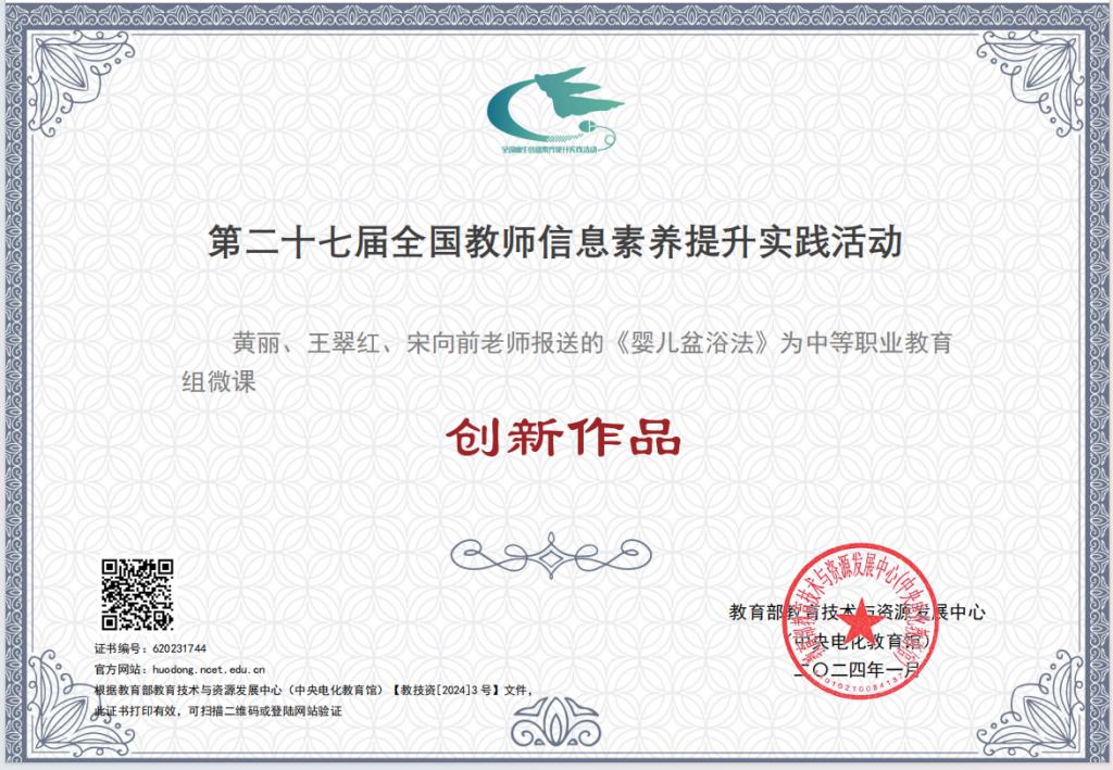 近年来,学校遵循“专业、课程、教材一体化”建设思路,围绕卫生职业教育特点与卫生健康行业发展趋势,以数字化资源建设为抓手,深化信息技术在教育教学改革中的应用,不断强化师生数字素养提升。该课程 2022 年获评甘肃省职业教育在线精品课程,2023 年成为超星教学示范包并获评甘肃省职业教育一流核心课程;该课程中的实训微课《婴儿盆浴法》获第二十七届全国教师信息素养提升实践活动“创新作品”;《精雕细琢,打造精品——倾力建设国家级精品在线课程》被中华护理学会评为典型案例,并在全国护理职业教育学术会议上做了大会分享交流。该课程成功入围“国家级在线精品课程”,是学校顺应教育数字化战略发展潮流,深化“三教”改革,大力推动教育教学内涵式发展取得的重要成果。