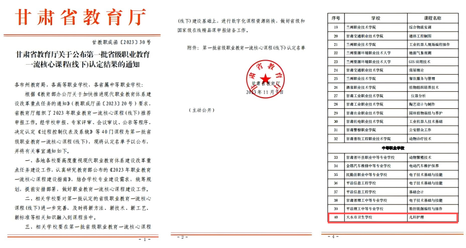近日,教育部公示了2023年职业教育国家在线精品课程认定结果,由黄丽主持,宋向前、孙文婷、王翠红、左楠、田玮玮老师参与建设的《儿科护理》课程成功入选,这是我校在六门“省级在线精品课”基础上入围的首门“国家级在线精品课程”。