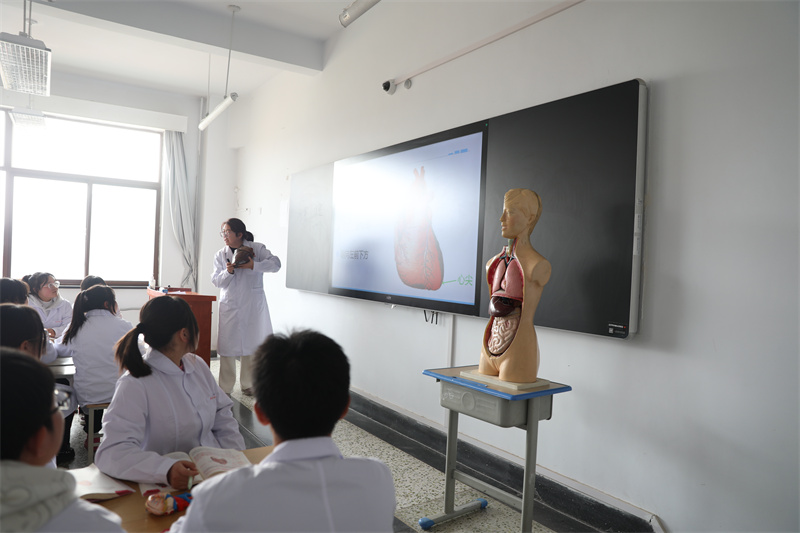 靳鹏老师就《解剖学基础》课程中“心”的内容开展教学。通过多媒体手段导入新课,运用人体解剖图、动态演示图、视频、心脏模型等多种教学资源,从心的位置、毗邻以及心的外形三个方面进行了讲述,并且提炼“一尖、一底、两面、三缘、三沟”的口诀便于学生理解。课堂上,运用讨论法,让学生分小组借助模型来强化记忆,巩固教学内容。整堂课环节完整,教态自然,语言清晰流畅,师生互动气氛融洽。
