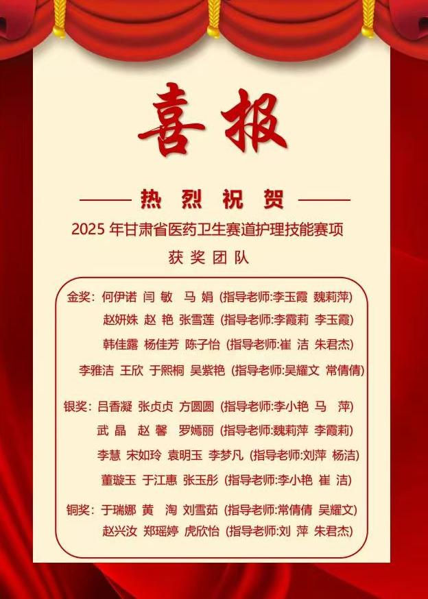 近日,由省教育厅、省人社厅、省财政厅、省总工会、甘肃中华职教社等5部门联合举办的“技炫青春、能创未来”2025年全省职业院校学生技能大赛圆满落幕。我校17支参赛团队55名选手,分别参加了由甘肃卫生职业学院承办的养老照护赛项和临夏现代职业学院承办的护理技能赛项,参赛选手们凭借精巧的案例设计、扎实的专业素养、出色的应变能力和良好的团队协作精神,在众多强劲对手中脱颖而出,15支团队48名选手荣获6金6银3铜的优异成绩,获奖率达88%,值得一提的是,金牌获奖率达35%,远高于全省10%的金牌获奖率。黄丽、李蕾指导的养老照护参赛项目和李玉霞、魏莉萍指导的护理技能参赛项目,将代表甘肃参加世界职业院校技能大赛总决赛争夺赛。