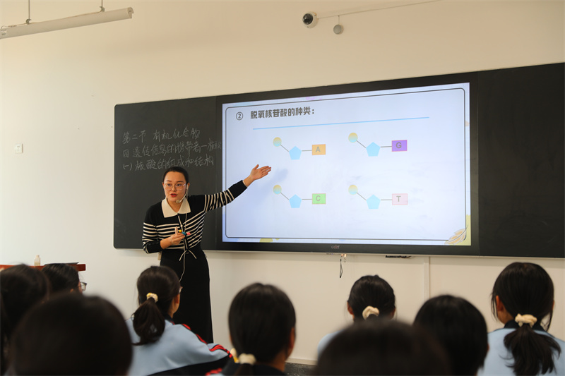 新课讲授环节,杜老师凭借扎实的课堂基本功,借助PPT动态演示,深入浅出地阐释了DNA双螺旋结构的三大核心特征——反向平行的双链结构、脱氧核糖-磷酸交替连接的基本骨架、碱基互补配对的原则。讲解层层递进,将抽象的分子结构转化为直观可感的认知对象,帮助学生快速建立起对DNA空间构象的清晰认知。为深化理解、提升实践能力,课堂设置“动手实践,建构模型”环节,学生以小组为单位,运用教具协作搭建DNA双螺旋模型。同学们在分工协作中提升了空间想象能力、动手操作能力与团队协作意识,课堂氛围热烈有序、互动高效。
