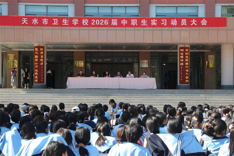 6月30日下午,在学校教学楼前广场召开2026届中职学生毕业实习动员大会。校党委书记张秀丽、校长宋继凯、副校长宋向前、副校长钱斐、实训处、学生处、23级班主任及全体实习生参加大会,大会由副校长宋向前主持。