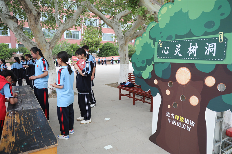 仪式结束后,全校师生在校园里共同参与了“涂绘心世界”、“艺术疗愈角”、“心灵树洞活动&解忧信箱”“心理小测试”、“爱的抱抱”、“涂色团扇”、“投壶”“筷子夹球”、“春随手拍”活动等户外体验活动。师生们在活动中实现心灵的深度放松、个性的自由表达,培养了团队合作意识,进一步融洽了彼此关系,起到了良好的心里疗愈效果。