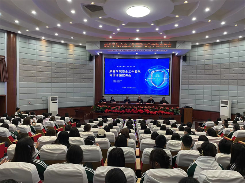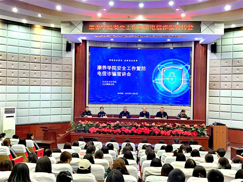 随着互联网的迅猛发展,学生网络生活日益丰富,各类电信网络诈骗案件呈高发态势。为进一步增强同学们的安全防范意识,提高识别能力,切实保障人身和财产权益。12月6日下午,学校组织康养学院全体师生在学术报告厅召开了安全工作暨防电信诈骗宣讲会。会议由学生处主办,康养学院和保卫处协办,学生处主任莫凡主持,特邀请天水郡派出所干警董瑞刚、刘晓霞、王朋军进行现场宣讲,副校长钱斐出席会议。