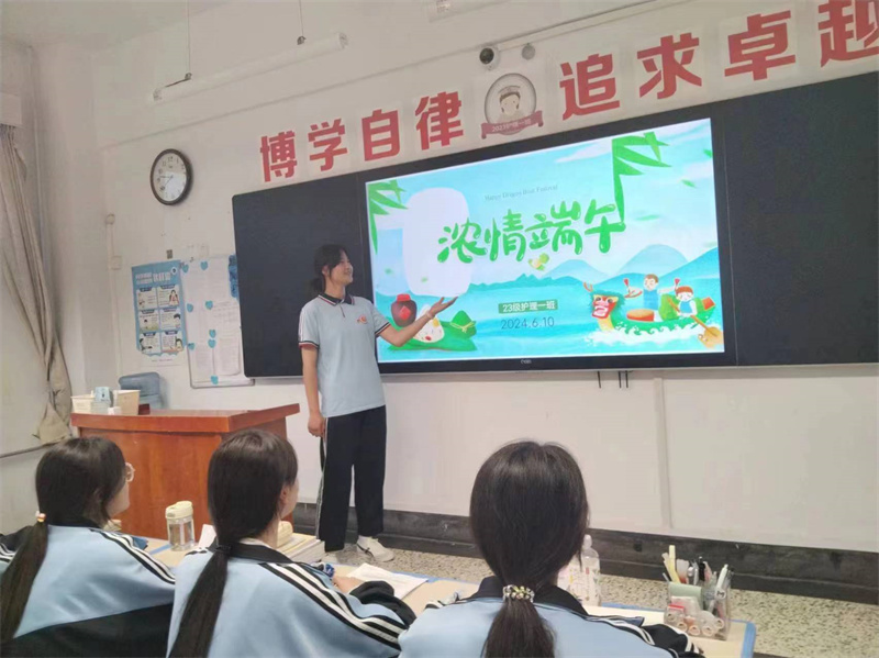 为了大力弘扬和传承中华优秀传统文化,引导教育同学们正确认识和理解我国传统节日,2024年6月10日晚,学校各班组织召开了以“家国情深话端午”为主题的班会。