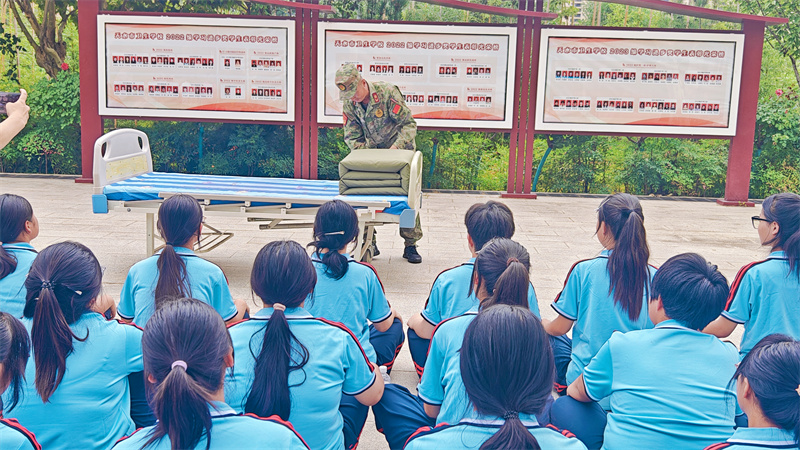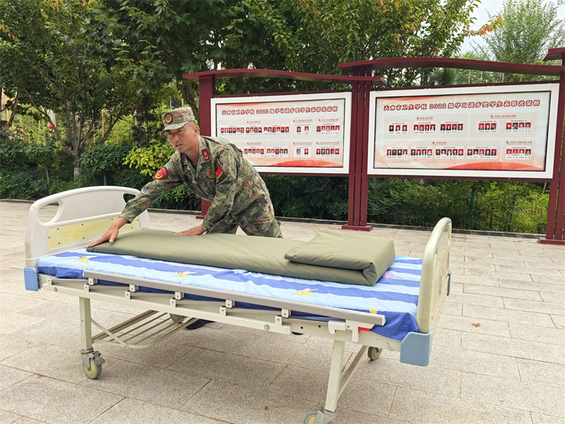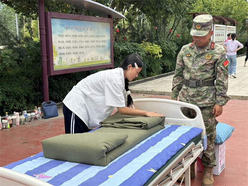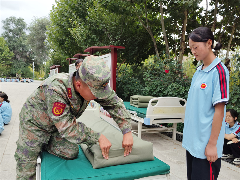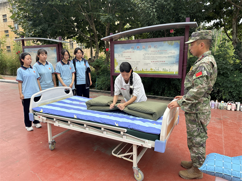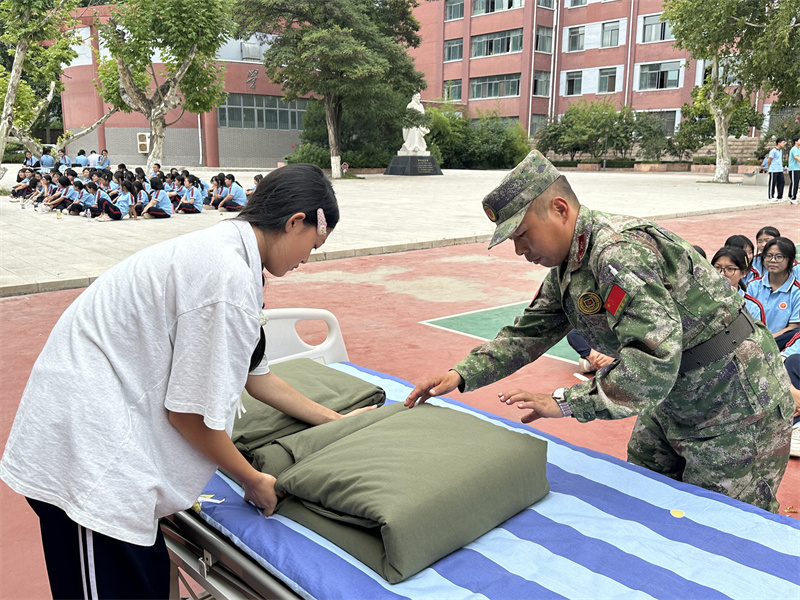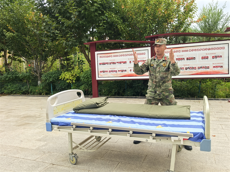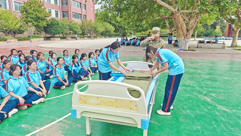出门看队伍,进门看内务。内务整理是军训的必修课,也是体验军训生活的基础。旨在培养参训学生养成良好的生活习惯和严谨的作风,提升自律性和纪律性。学生公寓是学校落实三全育人的重要阵地,也是德育工作和班级教育的重点环节,学校从精细化管理入手,紧抓内务细节,落实养成教育,在内务整理中融入健康教育和劳动教育,提升学生的综合素养。军训内务训练结合我校专业特点,在护理实训病床单元展开内务整理培训,经验丰富的教官和班主任们耐心指导,帮助新生快速学会内务整理。同学们谨记“三分叠,七分修”的口诀牢牢记住每一步骤,每一要点铺平、压实、翻折抠角、捏线、成型耐心细致地整修被子边角棱角分明厚度均匀诞生了方方正正的“豆腐块”,一棱一角之中细微修整之中更是磨炼匠心的过程。